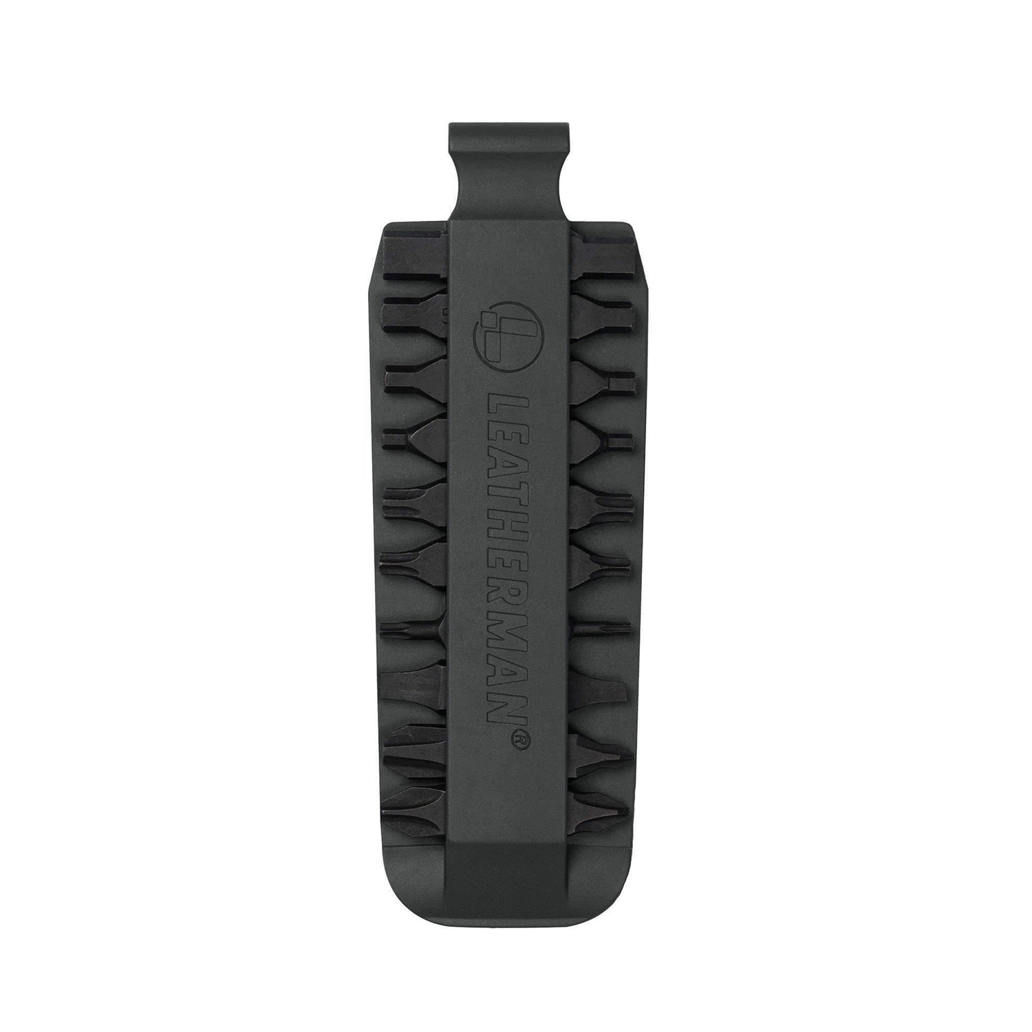 Translation missing: en.Black Leatherman bit kit holder with multiple interchangeable screwdriver bits arranged on both sides, featuring the Leatherman logo embossed in the center